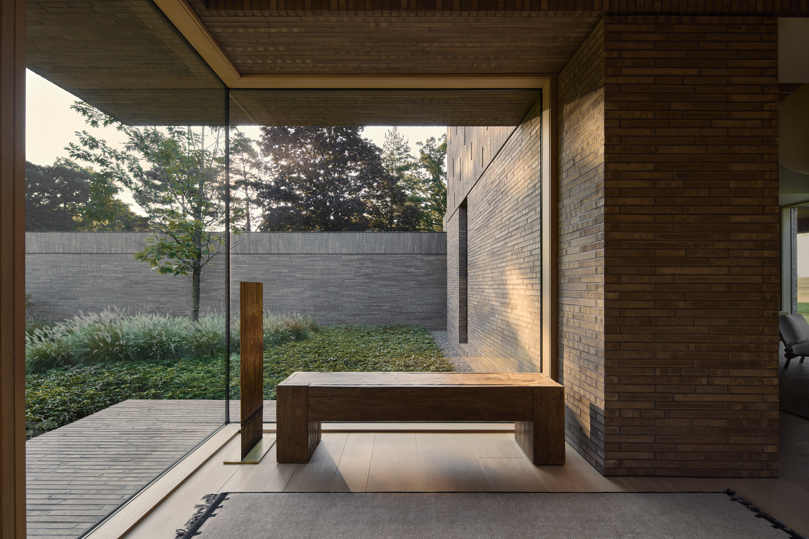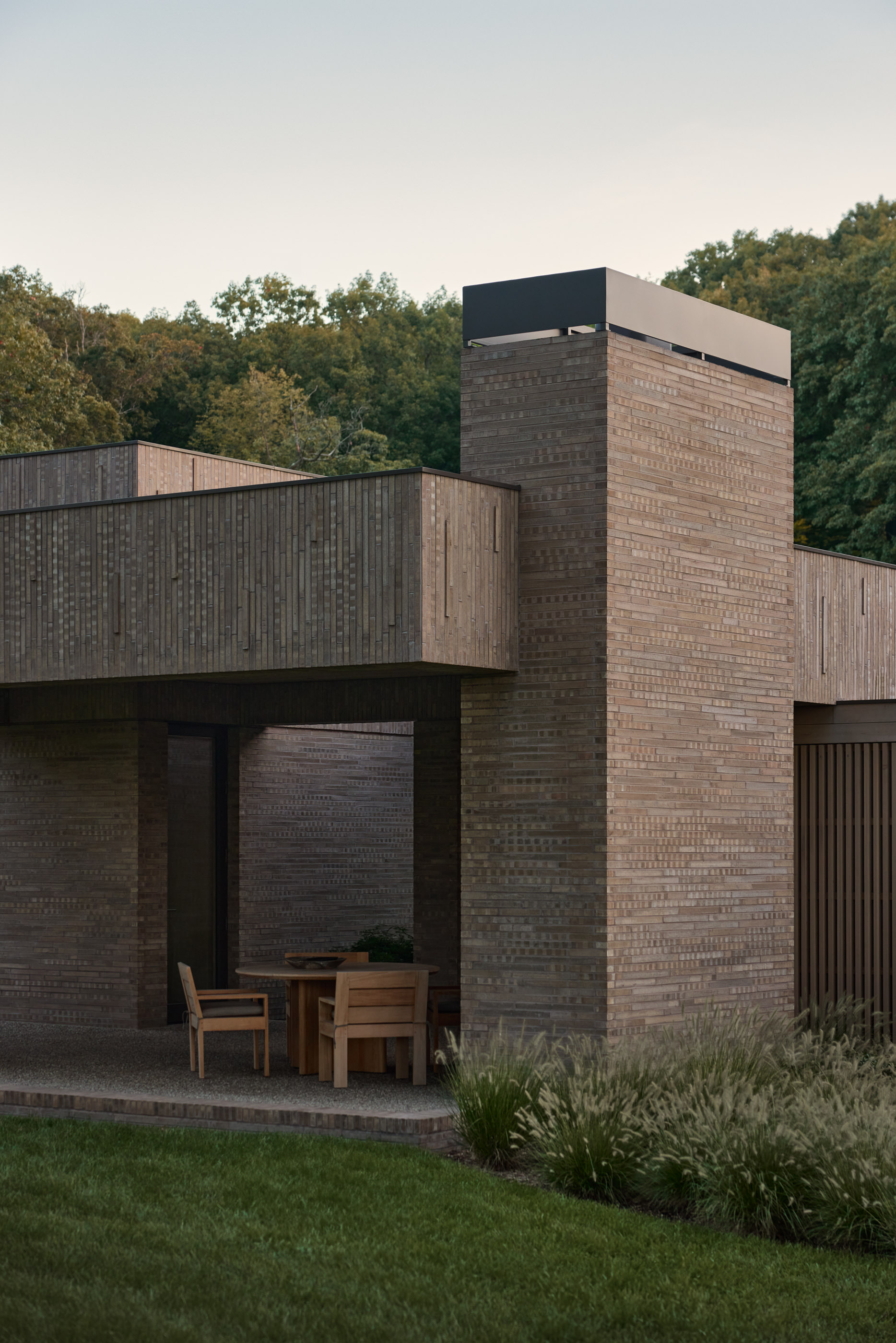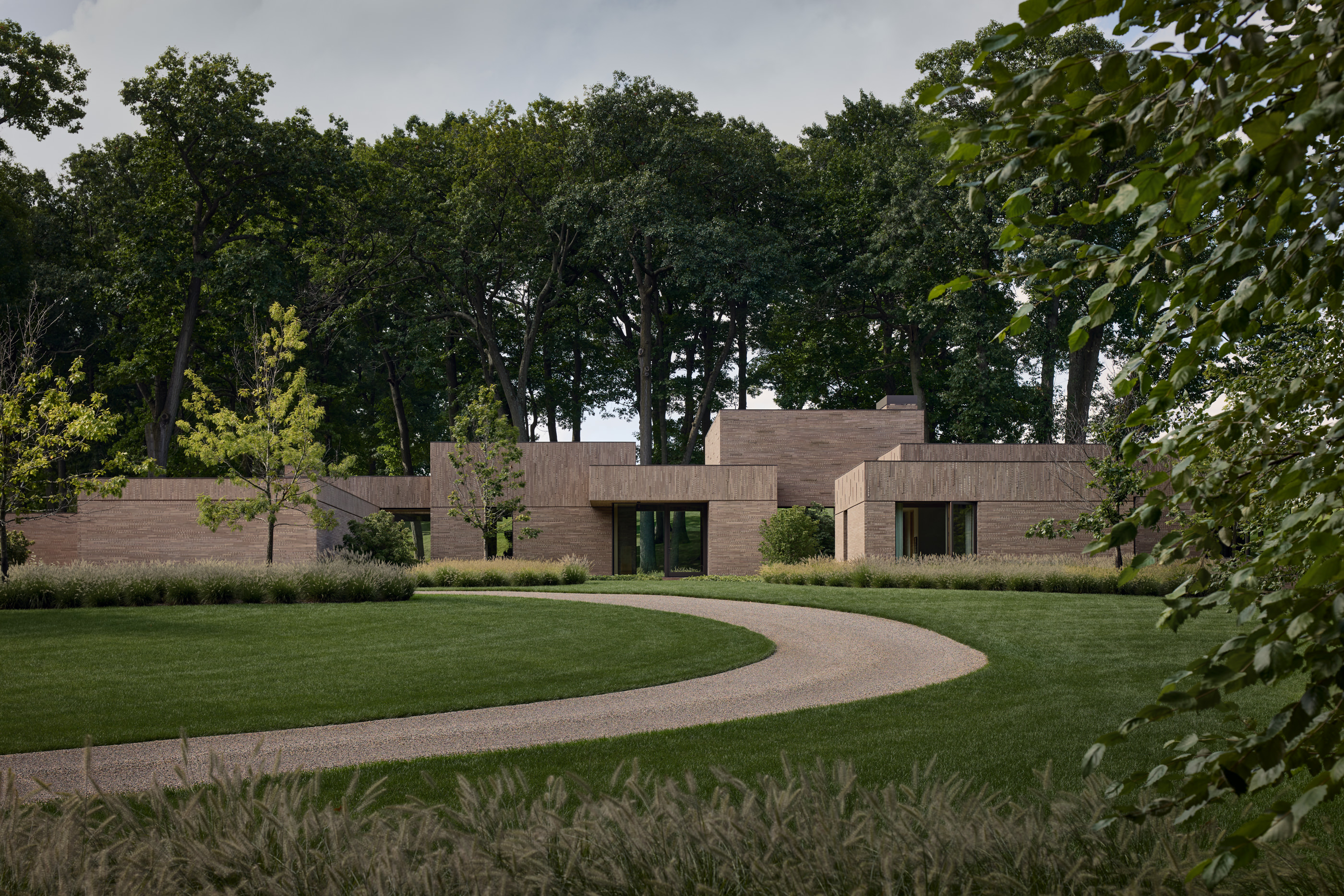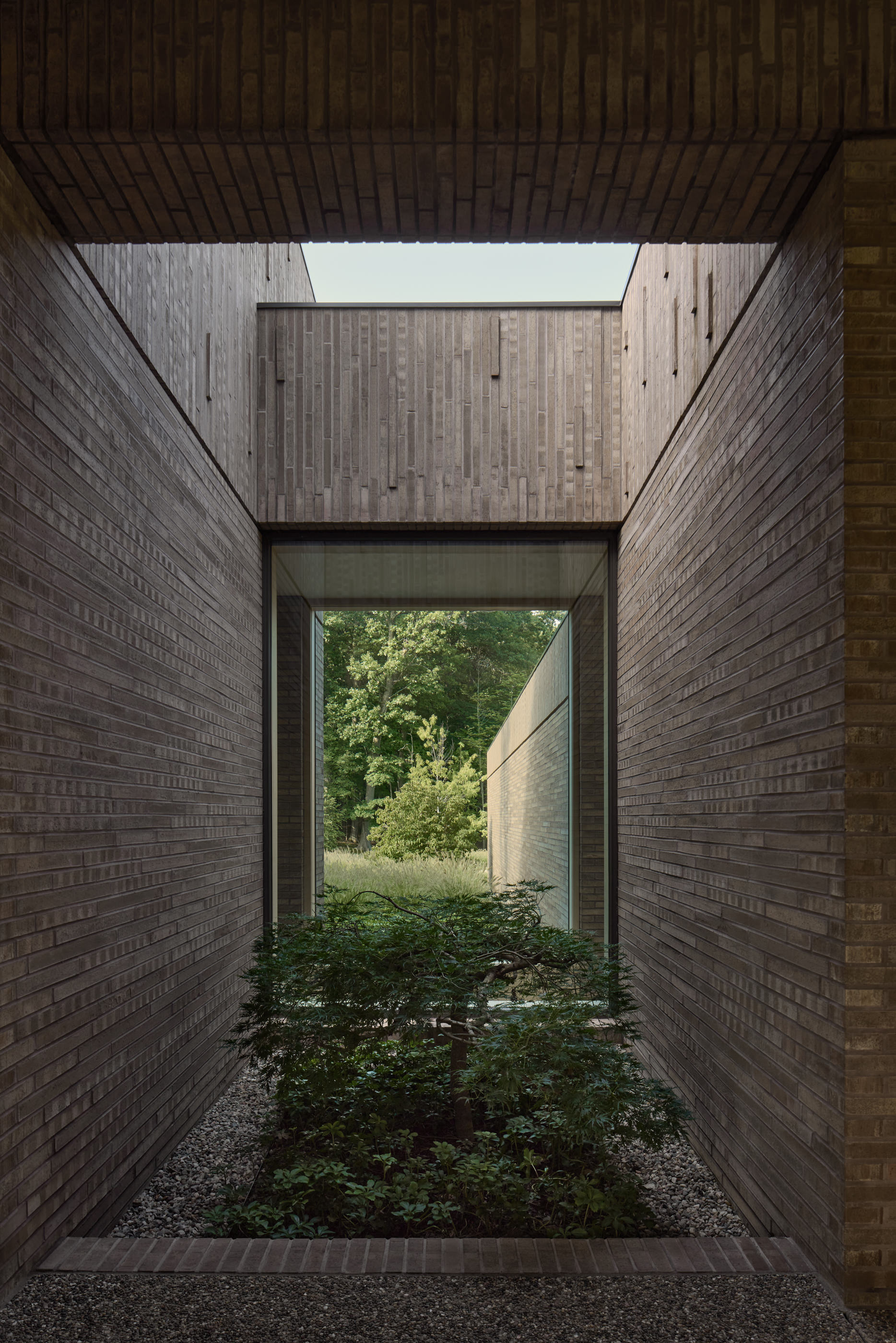 A series of pavilions comprise this single family home in Bloomfield Hills, Michigan designed by Adam Jordan. A pared back palette of natural materials — including a local brick that was selected so that the house would recede into the surrounding trees — unifies the volumes.