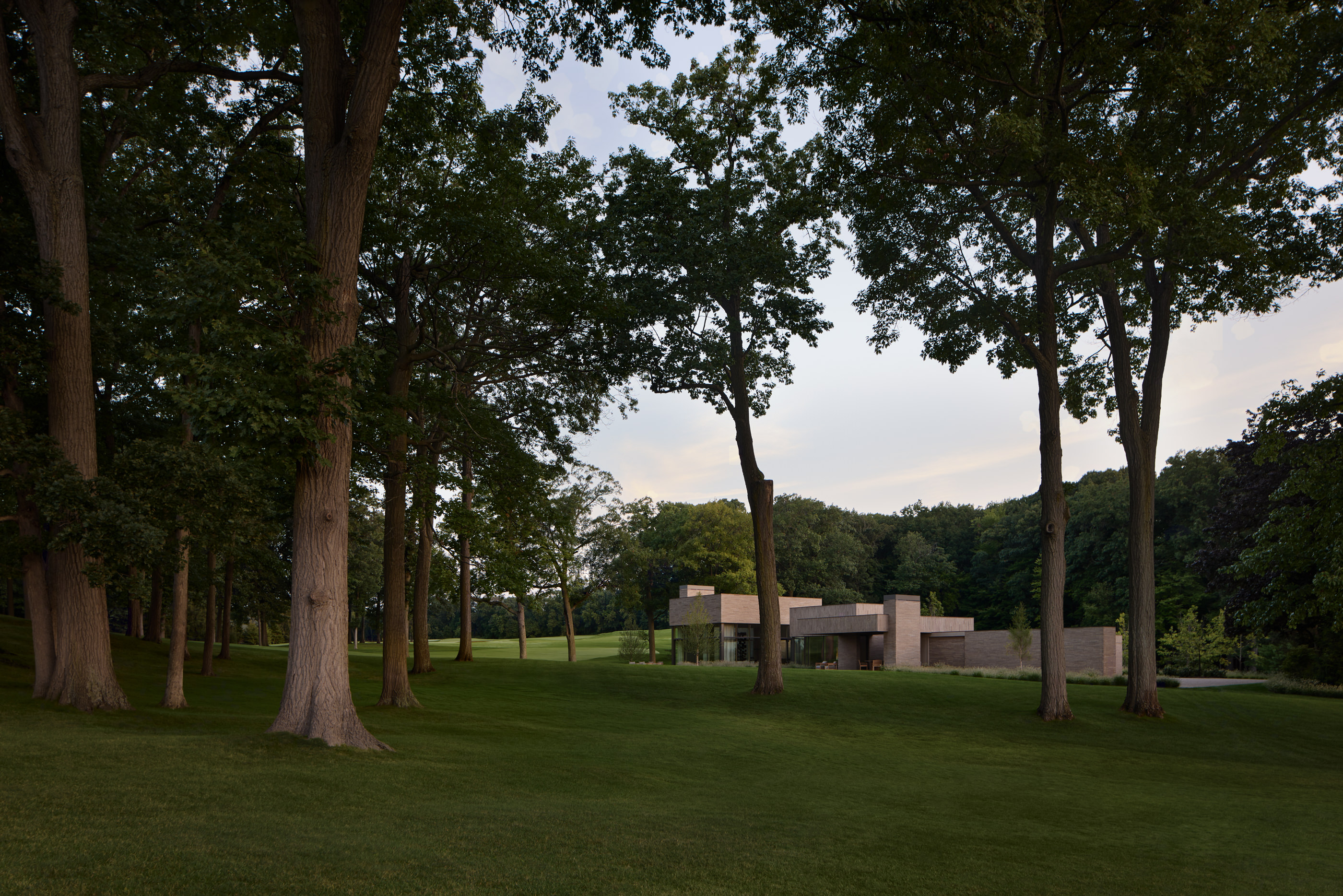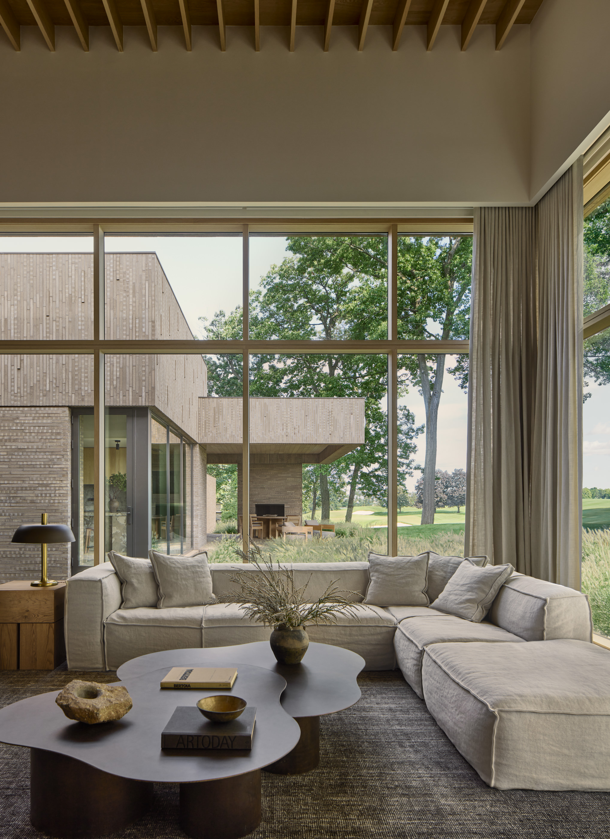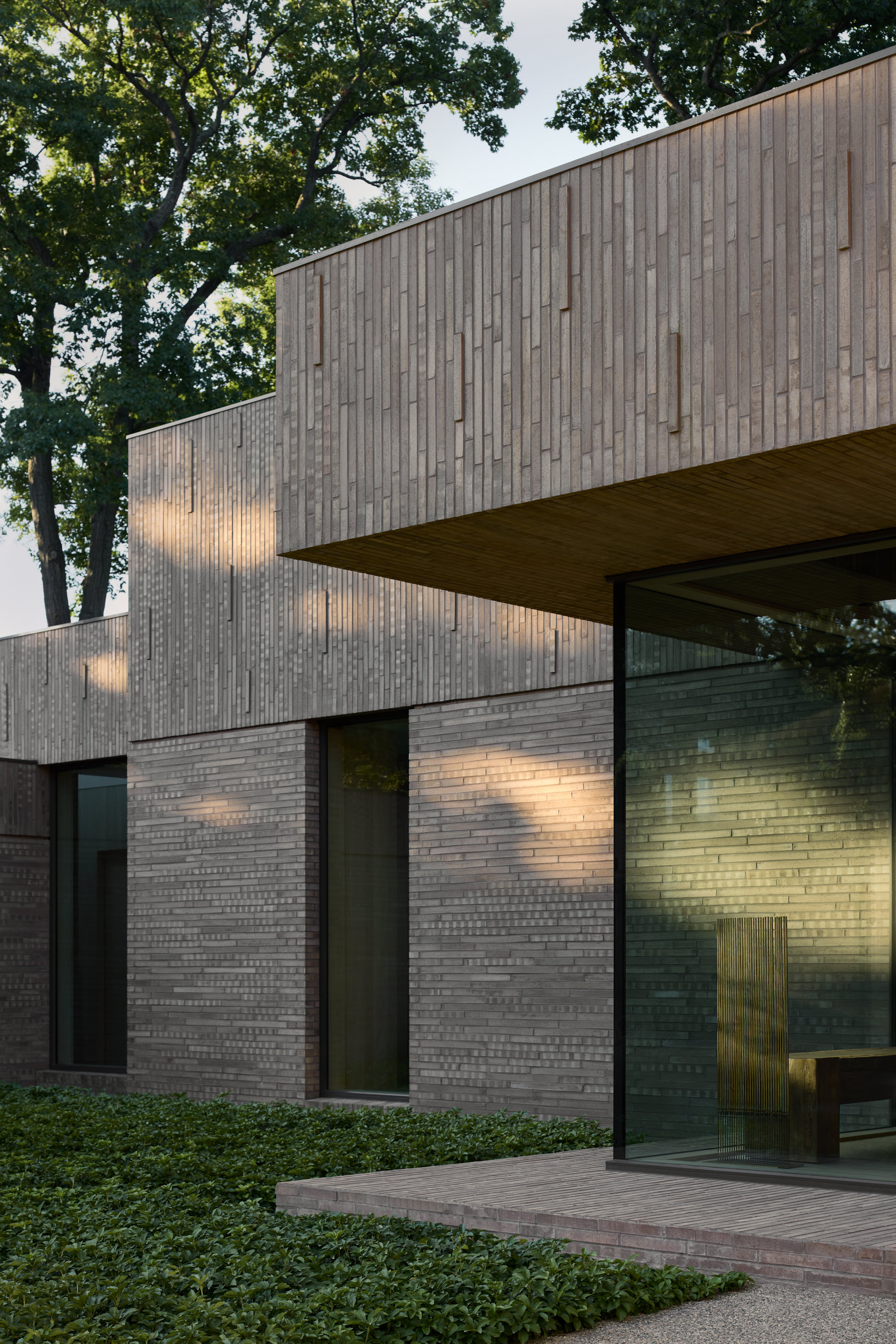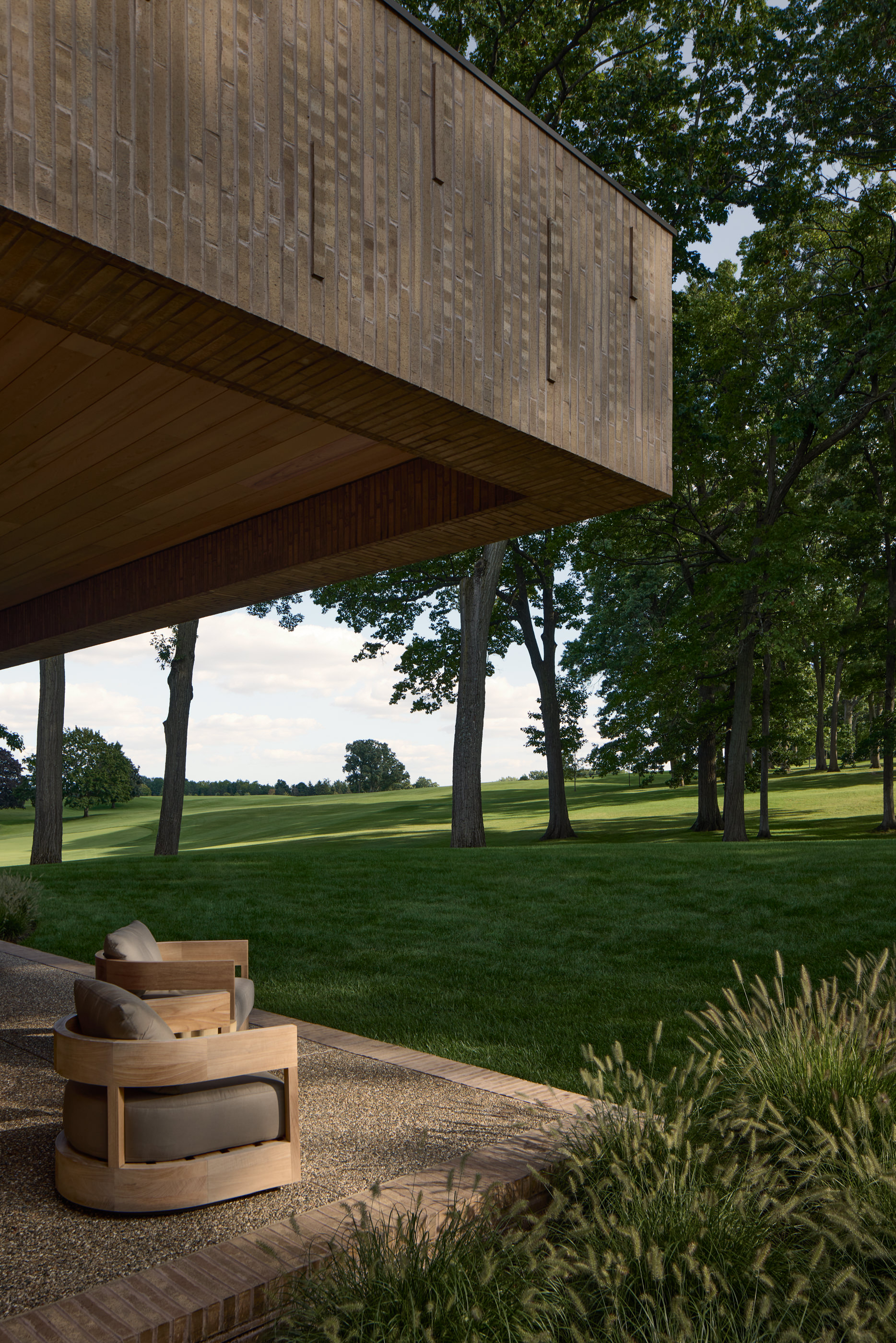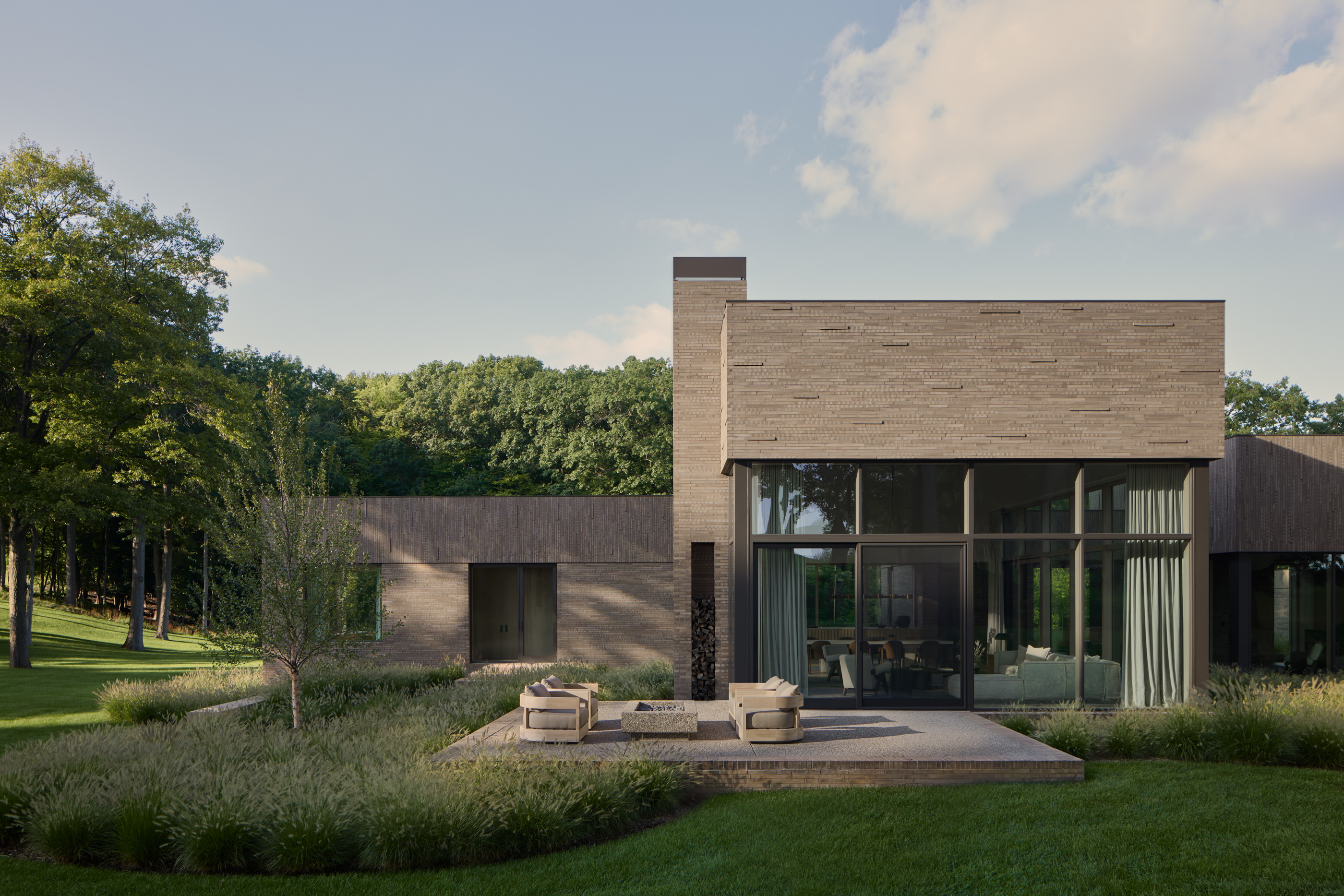 A series of pavilions comprise this single family home in Bloomfield Hills, Michigan designed by Adam Jordan. A pared back palette of natural materials — including a local brick that was selected so that the house would recede into the surrounding trees — unifies the volumes.