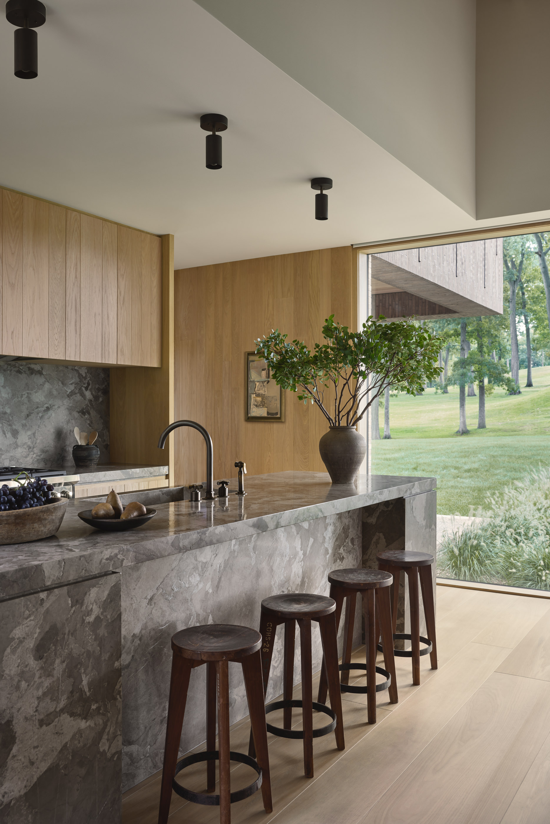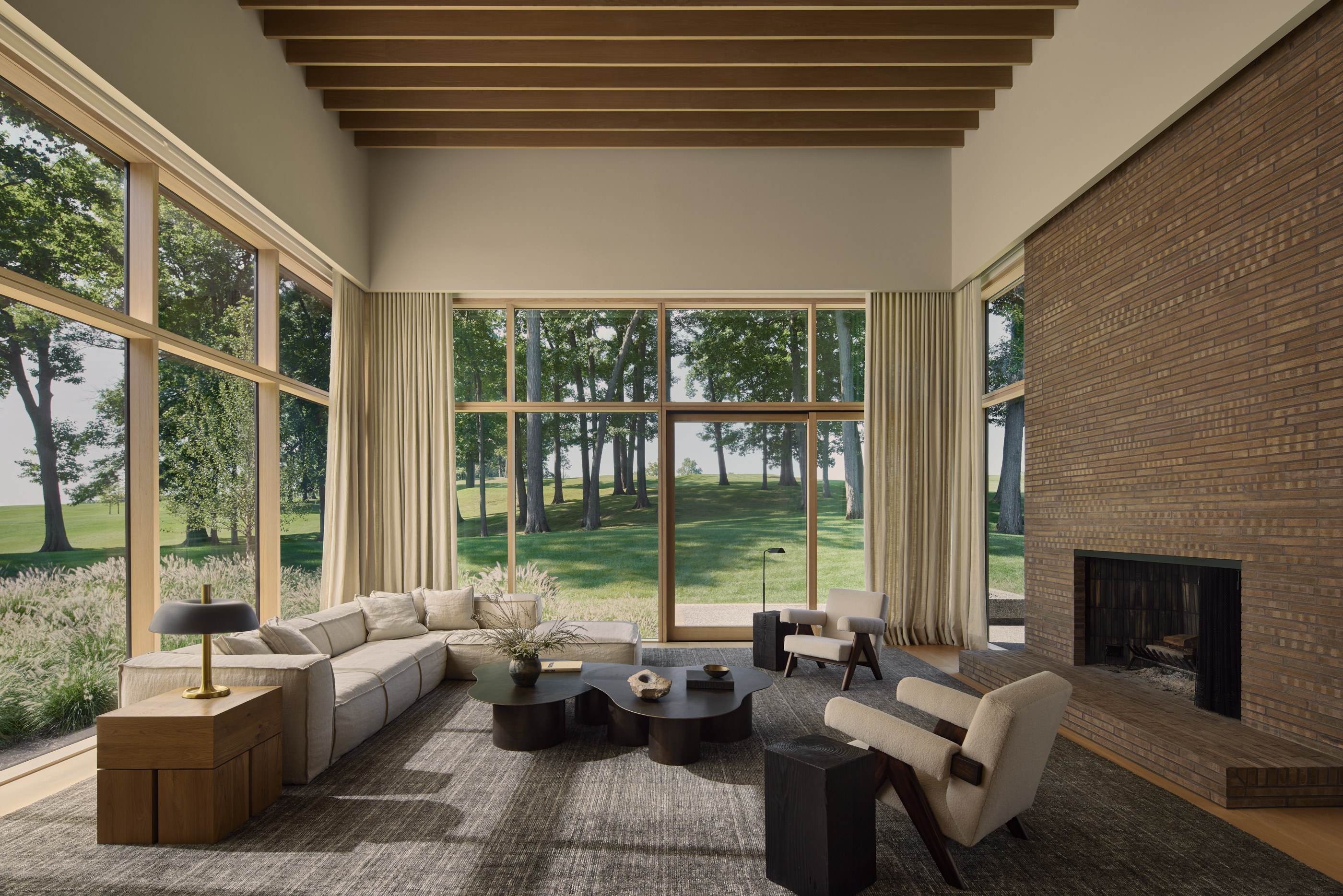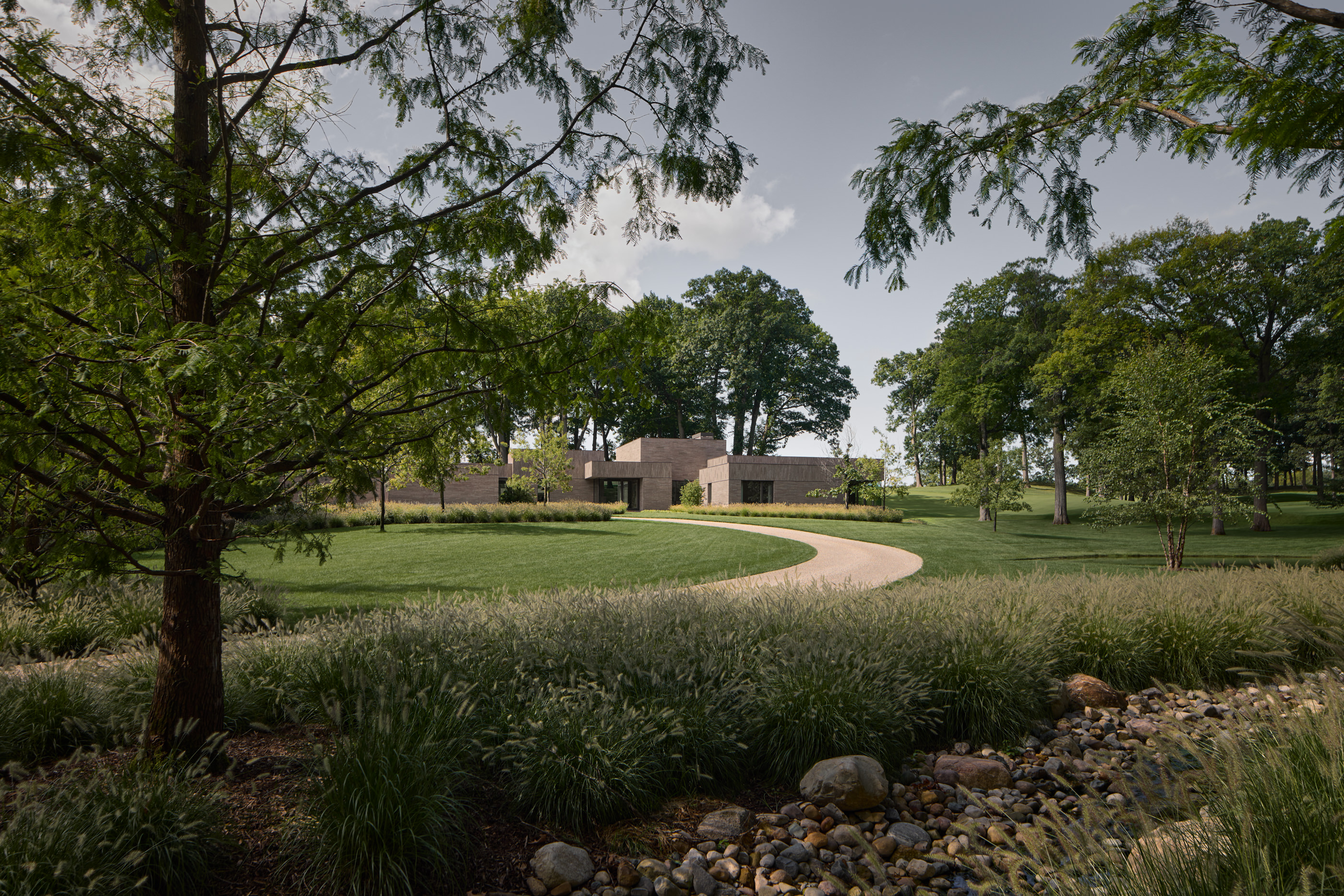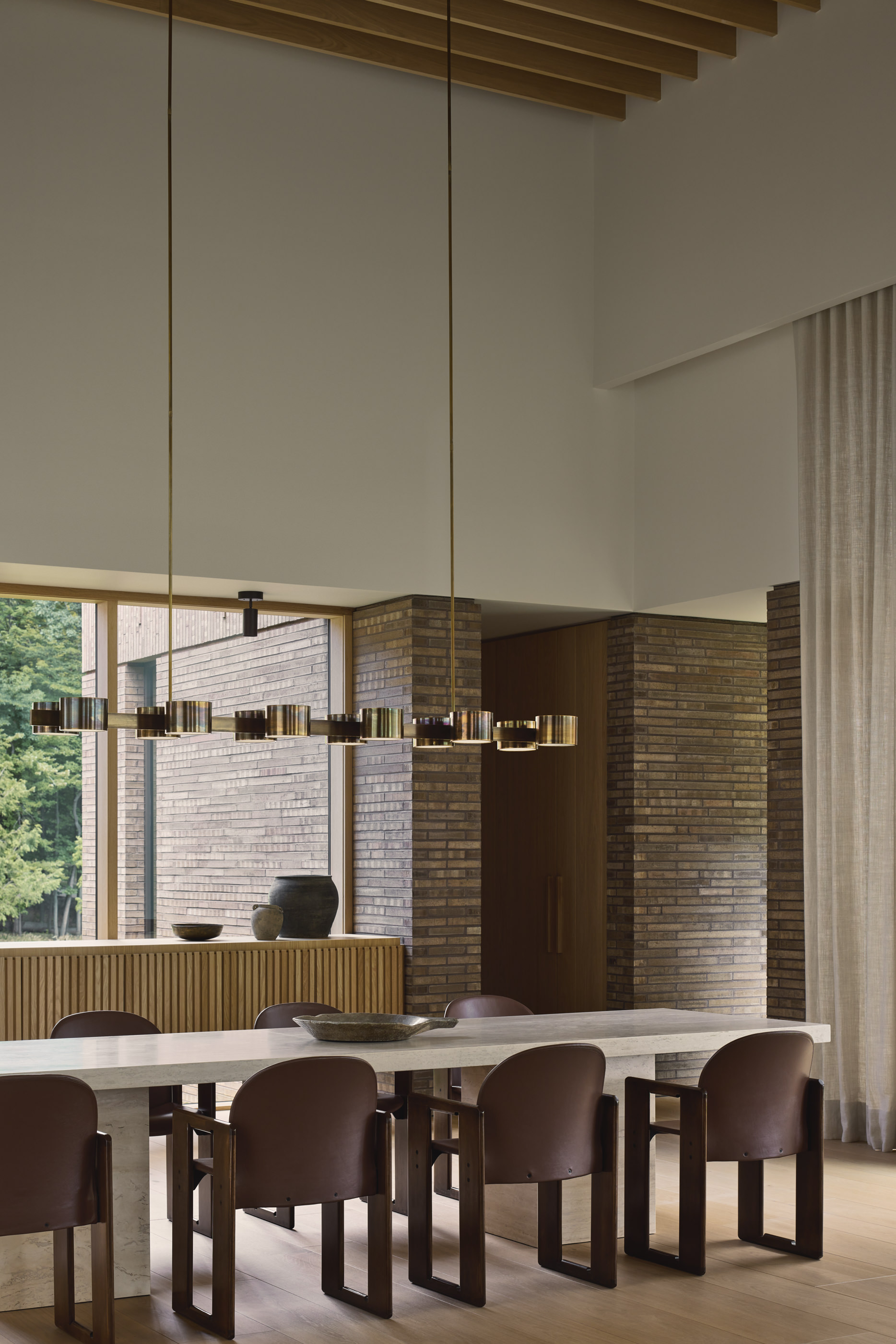 A series of pavilions comprise this single family home in Bloomfield Hills, Michigan designed by Adam Jordan. A pared back palette of natural materials — including a local brick that was selected so that the house would recede into the surrounding trees — unifies the volumes.