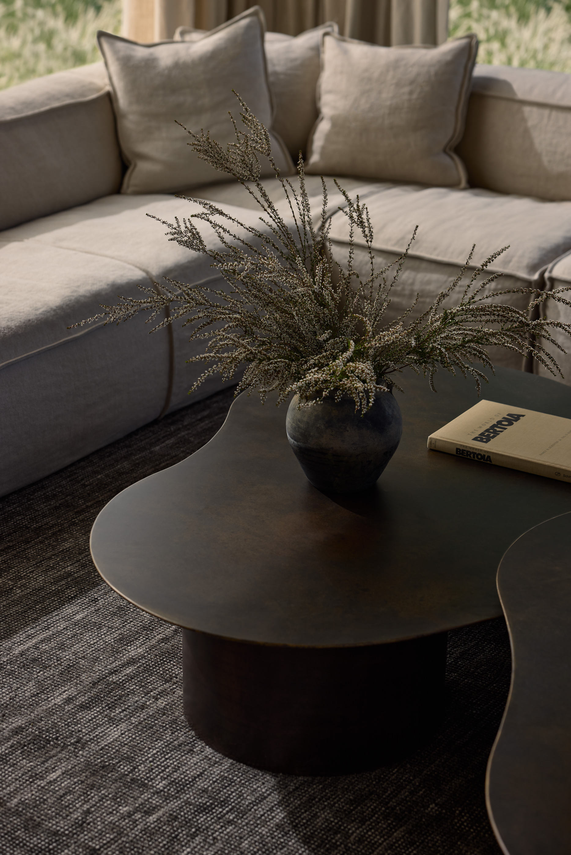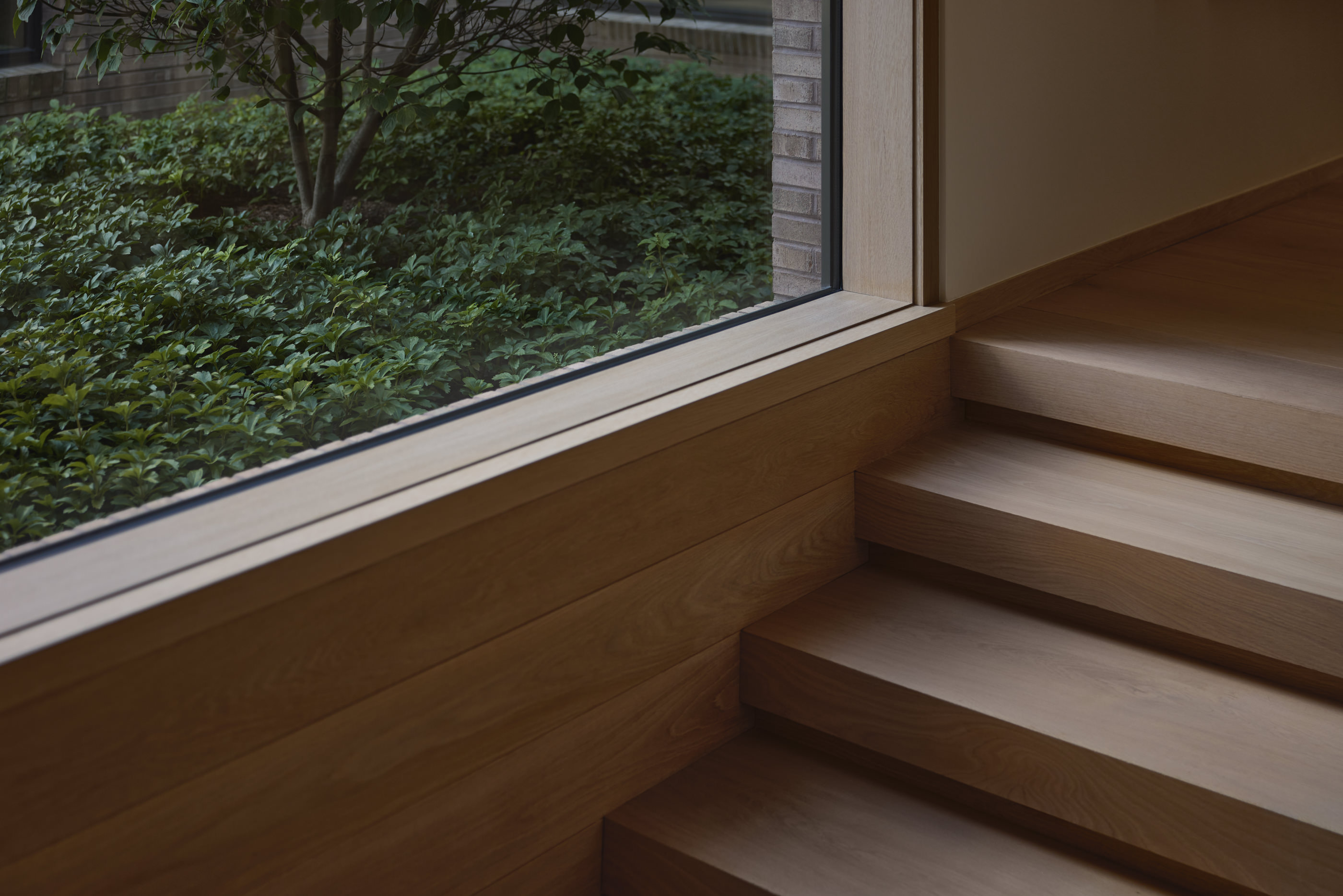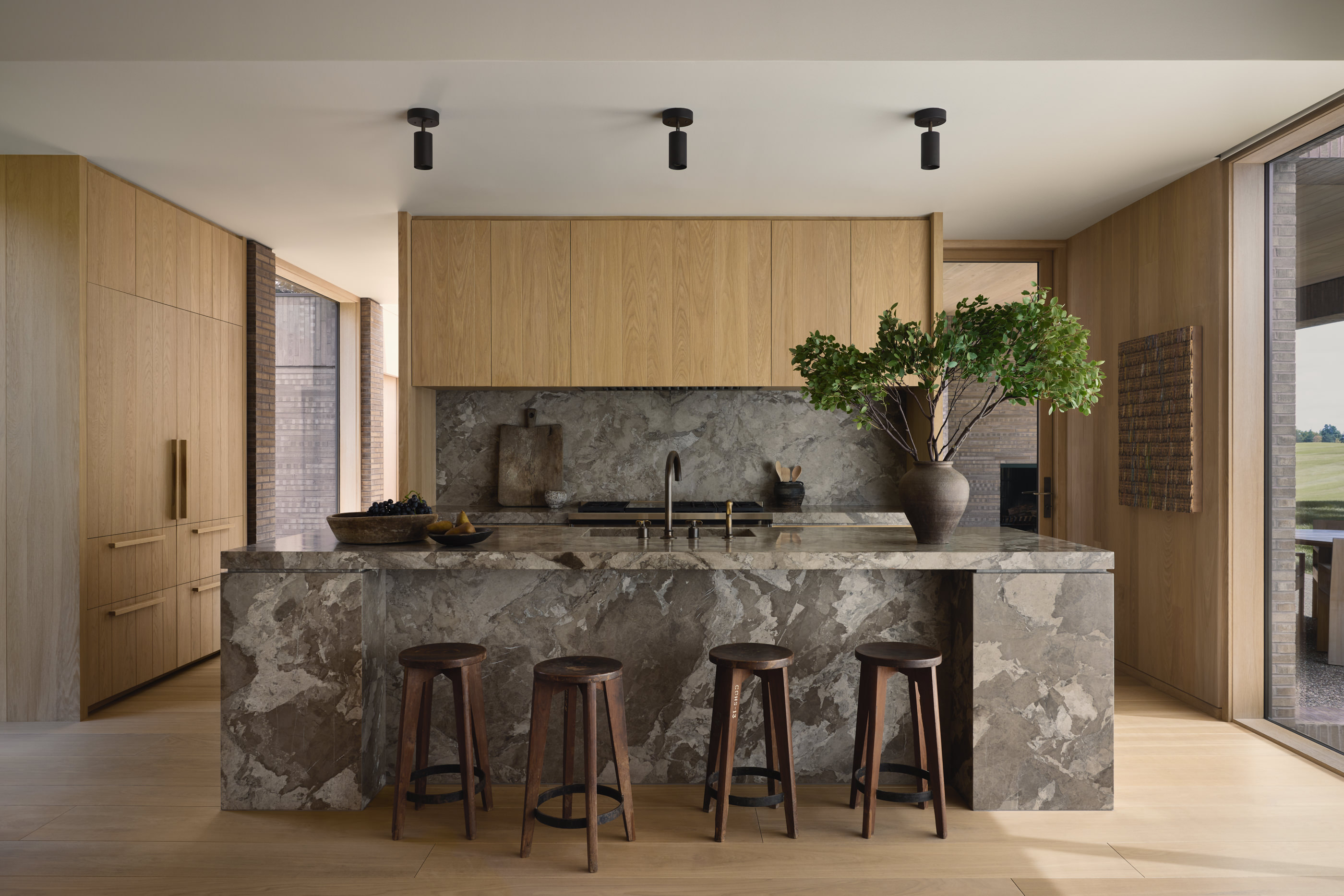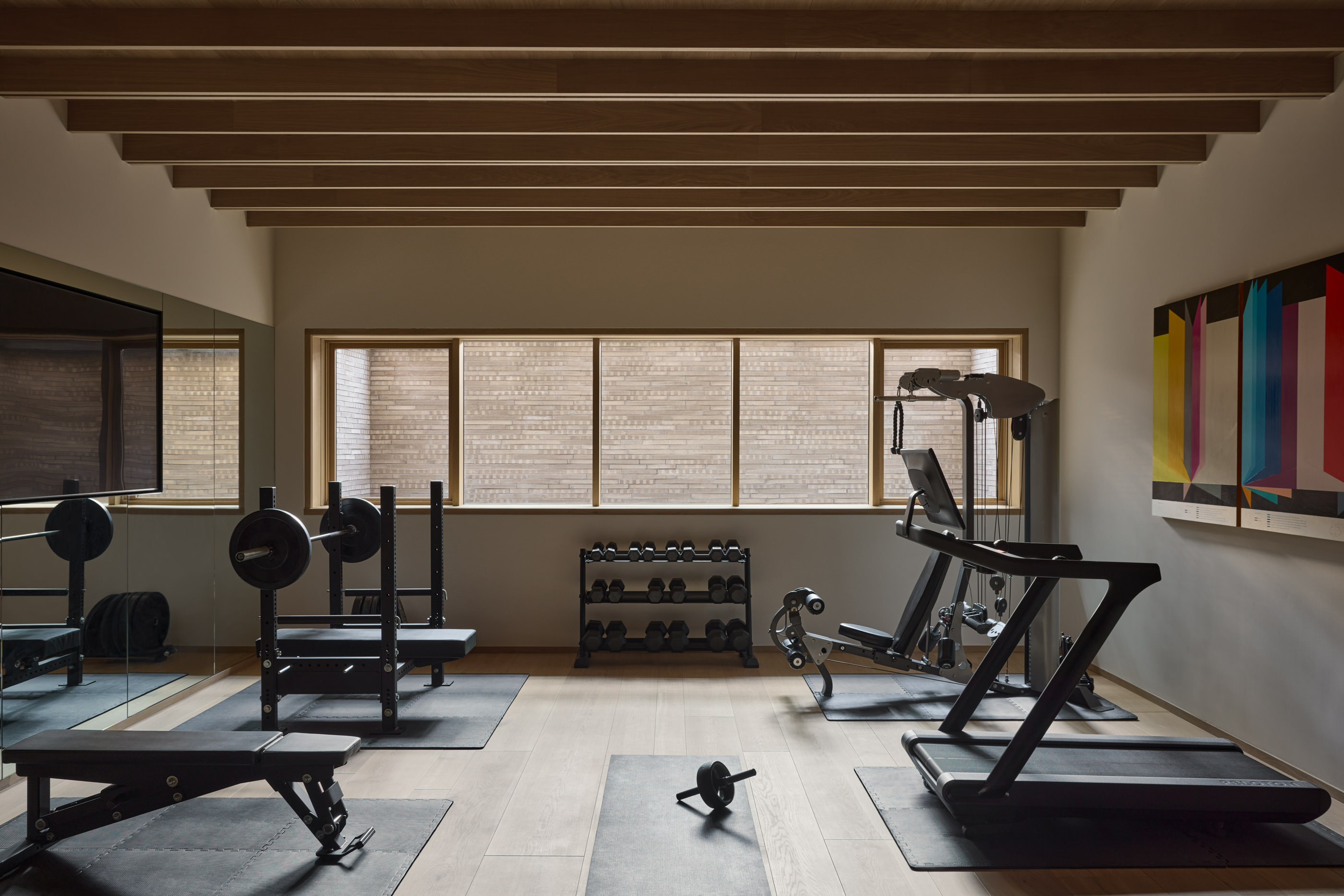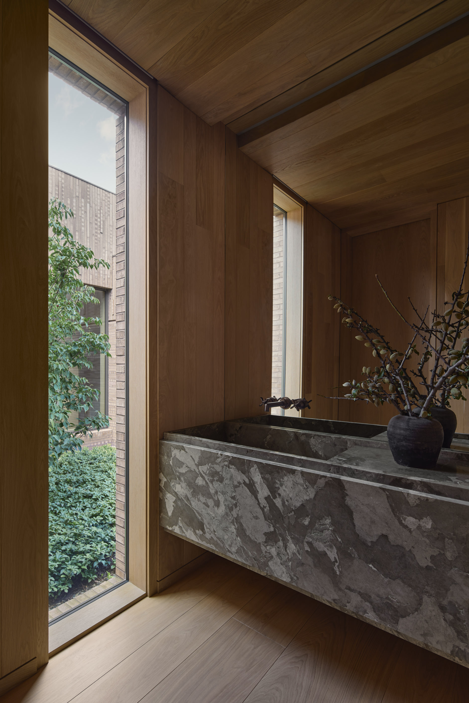 A series of pavilions comprise this single family home in Bloomfield Hills, Michigan designed by Adam Jordan. A pared back palette of natural materials — including a local brick that was selected so that the house would recede into the surrounding trees — unifies the volumes.